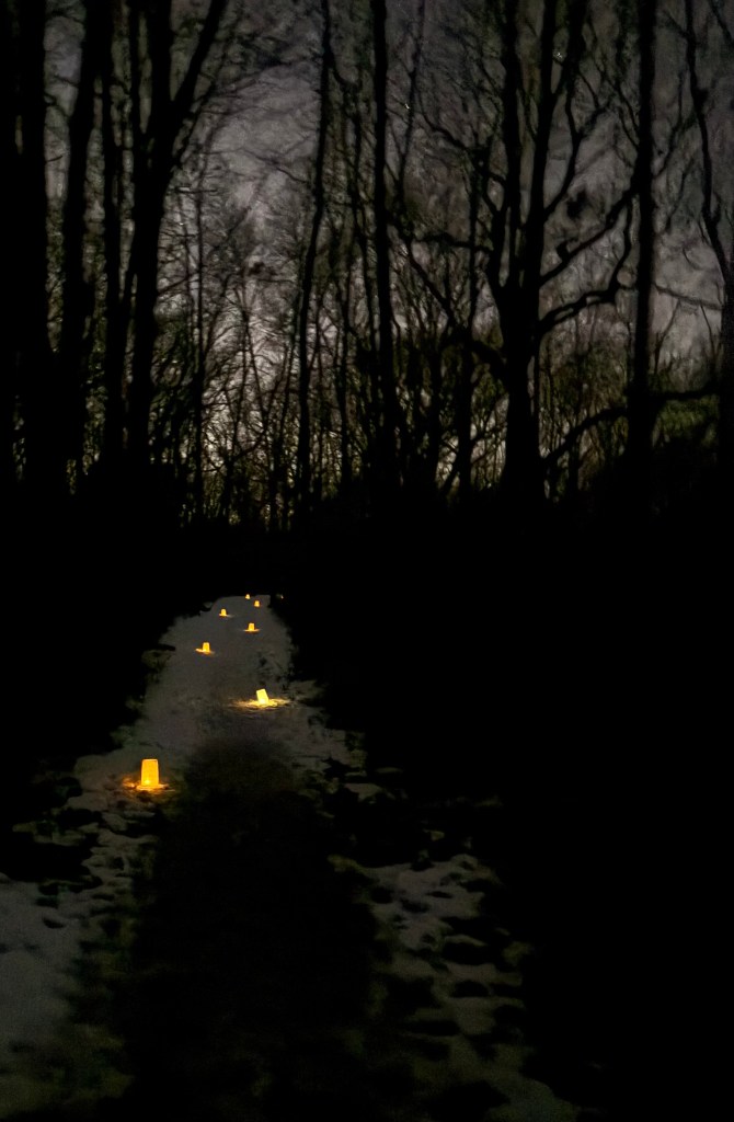 one of the local parks was having an event friday night – a candlelit self-guided trail hike – to celebrate valentine’s day. it is one of our favorite local trails through the woods and so we had reserved tickets ahead of time. only….in the way that actuallygoing gets in the way of lazingaround….we had to buck up and go.