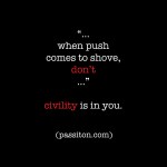recently i surprisingly found myself in a situation where i felt the kind of civility that is needed to accomplish anything was lacking. instead it was aggressive, pointed, antagonistic. “when push comes to shove” implies escalation and this, indeed, was the case. instead of actual conversation, it was a push-shove back-and-forth. instead of communication, it was a shining example of what-not-to-do.