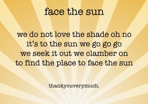 we wait – impatiently – for the mornings we can sit outside against the house facing the sun with our coffee. we hike in our magical bristol woods and sit in the nature megaphone, out of the wind, facing the sun. we have sat on mountaintops facing the sun and on rocks beside the lake facing the sun. in canoes facing the sun and on pontoon boats facing the sun. at outdoor cafes facing the sun and squeezing into windowseats facing the sun. on the deck facing the sun and in the dirt of the trail facing the sun. on the beach facing the sun and by the pool facing the sun. we sit on adirondack chairs that we move around the yard facing the sun and we lay in the hammock that we also move around the yard facing the sun. we are the dr seusses of ‘facing the sun’ lingo.