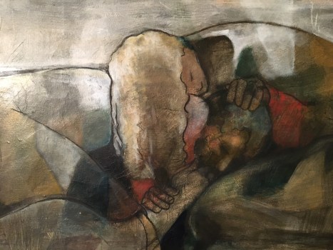 this painting now hangs in that living room, its horizon gazing out on a horizon also of water, of expanse. its solace echoing the solace we will bring for each other, two together in a strange land.