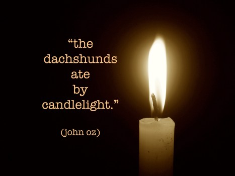 my favorite moment in a day of challenges that included having no electricity, came when he followed up on the power company update we texted him. with john oz wit and his you-do-what-you-have-to-do outlook he wrote back, “the dachshunds ate by candlelight.”