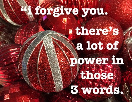 frank made sure to bring us the dvd. our favorite of the hallmark christmas movies, a season for miracles was scheduled for tv viewing at a time we were not available. and he knows. frank knows how much we love this movie during this season. we, i have to admit, spend just a little bit of time watching hallmark christmas movies, despite their obvious indulgence to happy-endings-aficionados. a season for miracles is such a story, but there are these lovely lines spoken by patty duke toward the end, that inevitable-anticipated-yet-yearned-for end. she wisely advises one of the stars of the movie, giving him something to consider, “i forgive you. there’s a lot of power in those three words. they can change the world.”