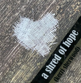 the prayer flags shred in the wind, sending prayers off into the universe. bits and pieces fall to the ground or fly off in the breeze. a perfect heart landed on our deck. a shred of hope.