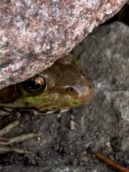 this is epic. epic is hiding. his sweet luminous green face peeks out from beneath a rock, the rest of his body hidden. he is earnest. he is cautious. he is aware. he studies his world – our pond. he jumps quickly away from anything he perceives as danger. bugs are his priority.