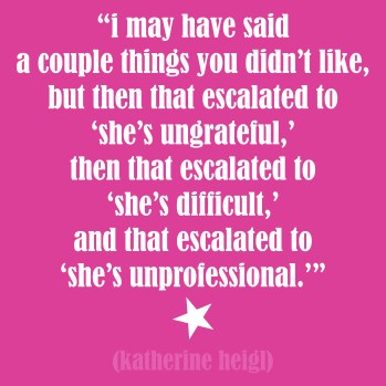 it is doubtful – even maybe unthinkable – that this same post from a recent CNN article, a quote by Katherine Heigl, would read, “i may have said a couple things you didn’t like, but then that escalated to ‘HE’S ungrateful,’ then that escalated to ‘HE’S difficult,’ and that escalated to ‘HE’S unprofessional.'” and why is that?