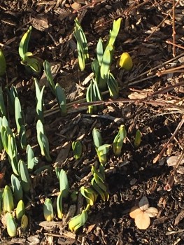 the snow was piled high on our walk around the ‘hood. stepping carefully around icy patches and those unsightly mountains of dirty snow next to the road, we strolled for a couple of hours. it was still freezing-cold out and the wind on our faces was biting. but the sun was out and, with icicles hanging off houses and treacherous sidewalks, we were stunned when we came upon this sight – early bulbs rising out of frozen ground, in a sheltered and sunny spot on the south side of the street. a signal that there is a new season to come, we practically danced on the sidewalk.
