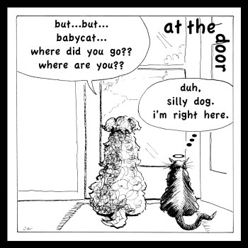 “i learned to love the journey, not the destination. i learned that this is not a dress rehearsal, and that today is the only guarantee you get,” pens anna quindlen. dogdog’s journey sans destination – for without the same human parameters that make us measure our lives, his is simply a journey without a destination – included babycat. and now, in his quest to find his cat, we can only hope that babycat sits by his side and reassures him, in his gravelly babycat voice, that he’s right there with him. our journeys include the angels all around us; they are right there, quiet and steady.
