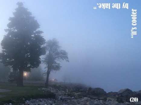 later that evening we talked to 20. he talked about the heat, about how early it is in the summer to be this hot, how the dew point and the humidity were astoundingly high. had he been able to see us, he would have seen us shrug in overly-feigned flippancy before we said, “oh, really??? it’s muuuch cooler by the lake!”