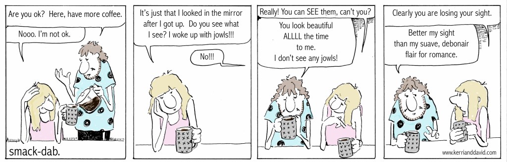 we have decided that we simply cannot pine for what our bodies were like or could do back before we knew each other. now is now and we are lucky to have that. and so, we will celebrate the laughlines and the readers and changing bodies and funny long errant eyebrows. we’ll roll with the surprises as they arrive, with gratitude, laughing as much as we can, and we’ll stay right here in the middle of this aging thing – together.