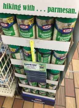 one of the funniest things to come out of joey coconato’s backpack out in the middle of nowhere was a can of kraft grated parmesan cheese. there were definitely other funny things too, though: a bottle of sriracha, a dozen eggs, avocados, brats, bota box wine. he is not your regular backpacker. joey is not afraid to carry stuff. he’s not afraid to go back-country. and he’s not afraid to bust the norms. passing this display in the grocery store made me laugh aloud and think of joey.