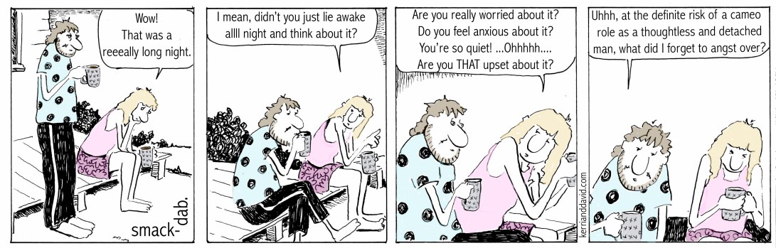 on the other hand, it takes david about six seconds to fall asleep and – perish the thought – stay asleep. there is little to no tossing, turning, blankets-on-ing-blankets-off-ing, staring-at-the-ceiling, looking-at-the-clock. somehow it is possible for him to empty-his-mind-of-all-troubles and just sleep.