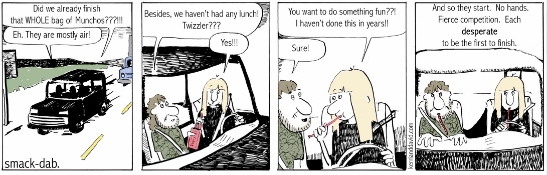 the truth is, i’ve had a lot more experience in twizzler-eating, so i have an edge. my twizzler days go way, way back to earlier times. to get me through driving all over the country loaded down with cds and maps, my sweet momma would send twizzlers in care packages, along with peanut m&m’s and those lance peanut butter crackers in the cracker-color that does not naturally occur in nature. some things never change, regardless of age.