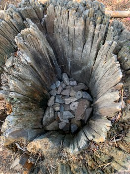 right off the side of the meadow as we re-entered the woods, there was this stump. like an opening flower blossom, it begged a look inside. i was surprised to find rocks of all sizes in there. a container of autographs, evidence for those who had passed by. we added ours to the assembly, rocks specifically chosen by hikers who placed their i-was-here into the hollow cavern of the stump. there is something about leaving a token behind, yes, encouraging and reassuring that upon our return someday – should we return to that very spot – it could be there and we would be reminded that we had passed that way.
