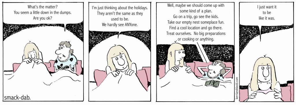 demographics have spread families out across the globe, work responsibilities make time off a challenge and the pandemic makes travel questionable. we age and lose grandparents and then parents and loved ones. the holidays take on more blue than iridescent tinsel-silver. so many reasons why people find themselves awake in the middle of the night, staring at the ceiling, wishing it was like it used to be. visions of large meals and preparation and trees and grand shopping and piles of presents and family-all-around and parties and fancy dress-up clothes all dance like sugar plums in our heads. things that used-to-be.