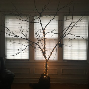 and the marvel continues. this very-large-branch-turned-christmas-tree, really like anything that is nurtured, has opened in the world. it is as if it has actually-self-actualized. though it would seem that remaining a limb on the maple out front might have been its endgoal, in its experience of being cut down it suddenly has new life, new possibility, new importance. the oh-the-places-you’ll-go story of its existence has undergone transformation. the you’re-supposed-to-be-a-branch-on-a-tree has been shattered and the old story of small-pine is re-created in an unassuming maple limb. because we paid attention.