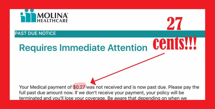 we are no longer on molina healthcare since during-the-year 2021, but for a company that literally charged $19,927 for the period of time we were, a balance due of 27 cents seems a bit inconsequential and the threat of policy termination and coverage loss – in the middle of a global pandemic – while they claim to be “caring about people and advocating on their behalf” and “helping those most in need” – well, it would seem that a bit of real-people-ness might need to shine through.