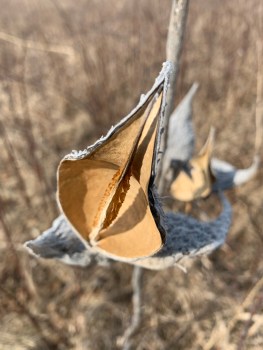 the color of a palomino, the pod of milkweed off the side of the trail captures my attention. though i want to touch it, to feel what looks like a velvety ear, i don’t disturb it. this pod has burst open, its seeds scattered, waiting for verdant spring and the eventual arrival of monarchs. the butterflies left the midwest for the winter, migrating, traveling up to 2500 miles to shelter and hibernate through winter in coolness that is not cold.