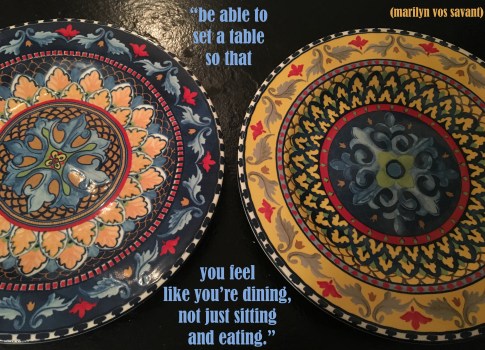 we choose our plates carefully. it might be a white crock night or a black plate night or maybe kenandloida colorfully-painted ceramic bowls or small plates. the vessel matters. and so do the cloth napkins. no matter what we are having for dinner – vegetable soup or a tagine or plant-based meatloaf – we try to pay attention to dining and not just eating.
