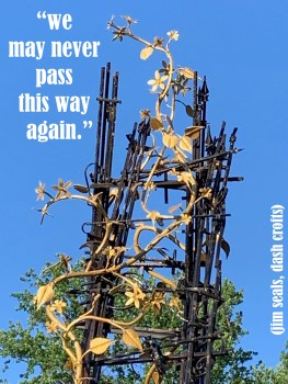 i know that we just never know. life has a way of teaching us that – again and again – though it is easy to forget, to push it aside. but the further up the vine we get, the more we recognize it. it is all so fragile. we may never pass this way again. simple. true. a calling, an imperative to say the stuff, to be vulnerable, to experience, to love, to acknowledge, to laugh, to cry, to be-with.