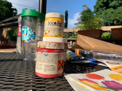 because we have been the grateful recipients of gift-rocks-on-the-trail we decided to leave some of our own. story of our lives, come to find out there are better tools for this than the ones we had. we had dollar store paint and brushes. those didn’t work. we moved on to david’s good acrylic paints from his studio and the dollar store brushes. these worked better, but didn’t yield precise lines. we found out later that there are real live paint pens – ones you can paint rocks with. they draw precise lines and tiny little scenes. (well, you draw them, they just make it all a possibility.) we’re going to get us some of those, i say.