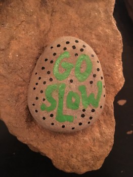 so i planted the painted rock on our sunroom table on top of sandstone from those smoky mountain trails. the other side of the rock reads, “no. slower.” you know…take a backroad, linger in the setting sun, sink under a blanket, climb a little slower.