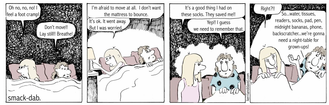 if you take away the lamp, the clock, a few pictures and a jelly jar of pens and pencils, it barely leaves room for the water bottle, tissue box, readers, cellphone, flashlight, itty-bitty-booklight, backscratcher, pad-for-the-stuff-you-want-to-remember-but-know-you-will-forget-by-morning, ankle socks and – when we plan ahead – the midnight bananas. if we determine anything else is of absolute necessity inthemiddleofthenight we will have to purchase a new night-table. bigger.