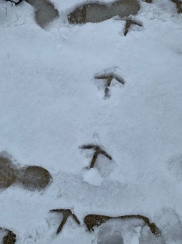 the crane’s footprints left no doubt that it knew where it was headed. solid and in a straight line, looking deliberate and measured, directly across the trail’s walkway toward the pond, looking for life-affirming nutrition. it had found itself in illinois – perhaps by choice, perhaps by instinct. there was a mate’s footprints as well.