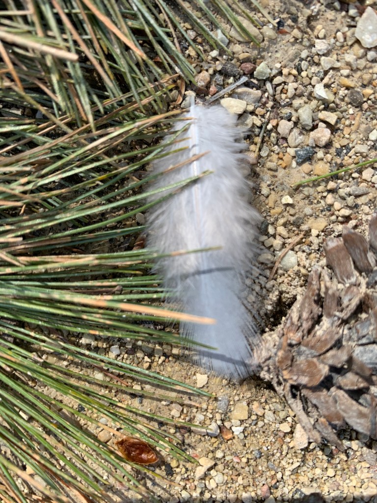it is likely the heron’s. we have seen a couple together out there – gliding through the marshland, standing regally by the side of the pond, walking sedately. we hiked past the downy feather, that had likely fallen from where down is hidden beneath the heron’s outer feathers, and i went back, the talcum powder white capturing my attention on the trail. sometimes i pick up feathers – to keep them, beautiful signs of divine and freedom and flight. i left this one on the trail, tucked between the pine and the cone, its texture begging notice.