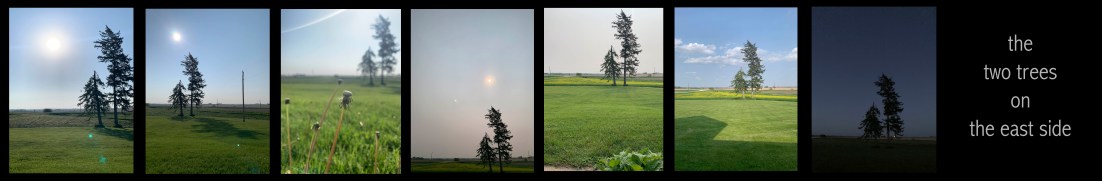 the light changed during the day. no surprise there. the sun rose to the left of the trees and burned its way into the sky. the trees glimmered and reappeared through the early morning thin layer of smoke from wildfires in canada, jetstreaming its way into the heartland. it was bright in midday and then the sky took on the echo of the western sunset. at night, the trees were still a presence, silent, rooted strength.