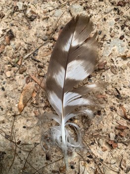 the owl feather lay on our trail. soft down curled at its base, it was striking against the dirt of our path. we stopped.