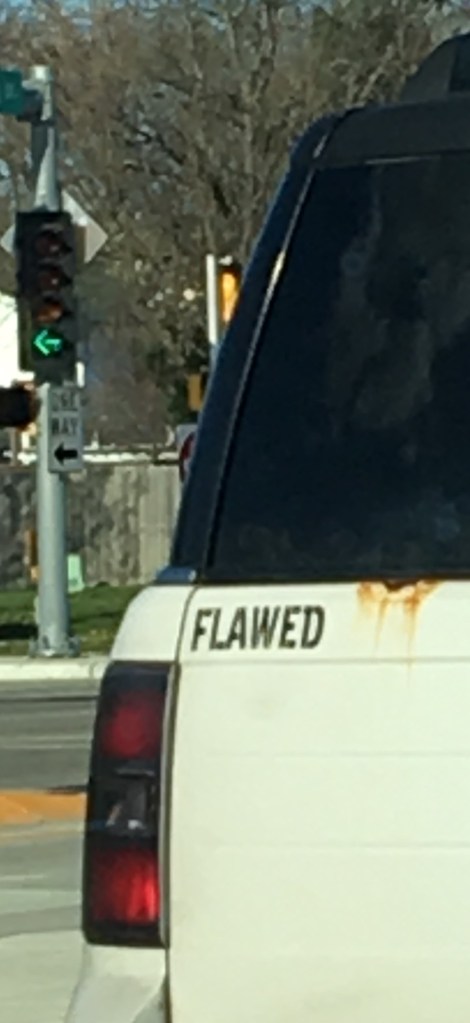 i pointed and said, “look!!!!” david turned his attention to the suv one lane over, the one with “flawed” stenciled under the back window, next to the weeping rust spot.