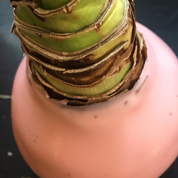 the pink-waxed amaryllis is just starting to get closer to blooming, a flower stalk straight and tall from the center of the bulb, the bud tightly wound. i visit with it each day, marveling at it.