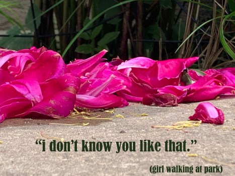 we overheard a conversation. a few teenage girls were walking together in the park, just ahead of us on the sidewalk. one turned to the other – in the middle of telling a story about a boy – and said, emphatically, that she told him, “i don’t know you like that.”