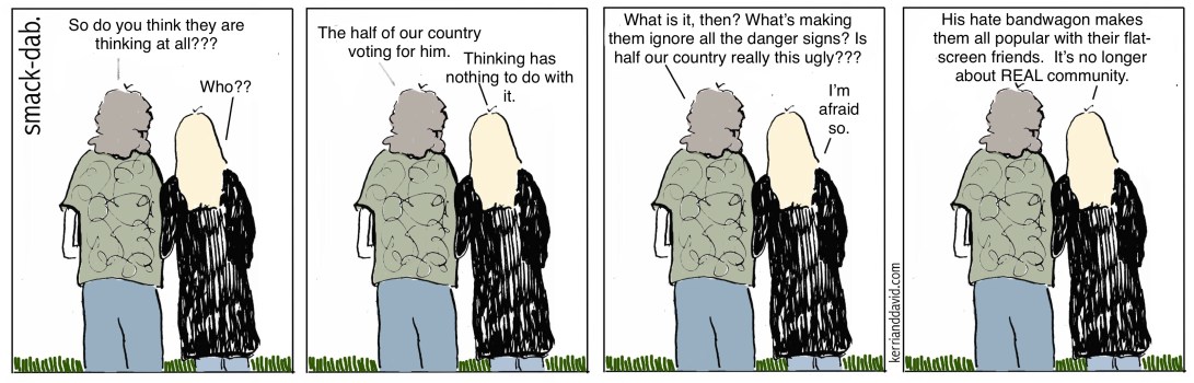 and what’s worse – it is because they are not thinking, they are not researching, they are not asking questions, they are not reasoning. they are merely believing what they are fed – hook, line and sinker. and they are flat-screening their ugly positions on social media, garnering likes and strokes – because they have forgotten what real community is, who real people are. the flat-screen has taken the place of real interaction, real communication, going to real places, doing real things, real life. the clique of people who would “un-friend” them in a millisecond – who are only on board the bandwagon with them for the same likes and strokes and hate-mongering – have become more important than real-live people. and they can’t see it.