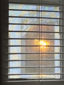 and so we watch through the mini blinds, through the screen and storm window, as – out across the deck, reflecting on the sunroom windows, just past the awning over the back door – the sun – rising over the lake – climbs to a place where its rays sneak around houses and gardens and reach out and out, brushing our windows.