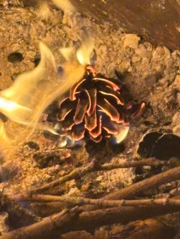 one by one we fed ten lodgepole pine cones into our small solstice fire. one by one we silently whispered a prayer, a wish, a hope for each one. one by one we watched them ignite, slowly burning off the resin and sending off invisible seeds into the universe.