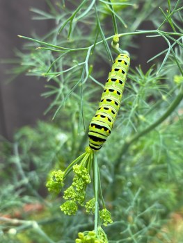 but for now – well, our $3.98 dill is strictly to support the lives of these two caterpillars and their transformation into butterflies (and maybe others i am unaware of as well). a worthy sacrifice. and one of these days, when i see a couple black butterflies dipping and sailing over our backyard, i will know that we were part of their metamorphosis.