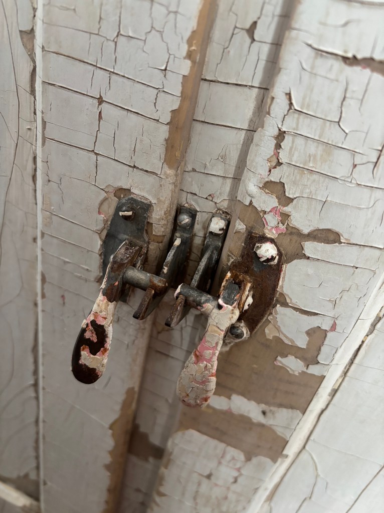 the chipping-peeling-paint white cabinet spoke to me. it sat on top of a side table in the booth straight ahead of the walk-through from one building into the other at the antique shoppe. it had some sweet personality and i visited with it, lifting the old clasp handles to open it and peer inside. with shelves ready for stuff to be tucked away, this little cupboard charmed me.