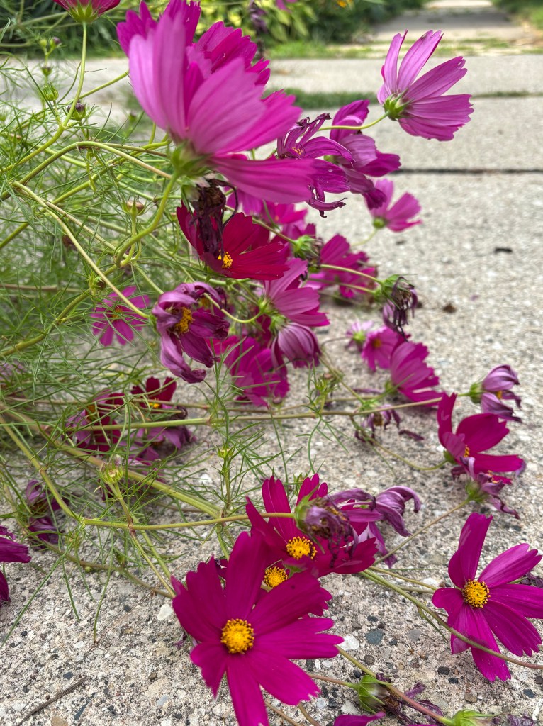 the cosmos splashed across a bit of sidewalk were an invitation for attention. that color! instantly-happy-hot-pink.