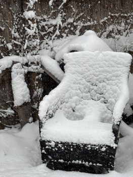 and the babycat chair – cloaked in snow – shielded all from the view of its real soul. its new trapping hides its decrepit wickered weave. one would not know not to sit – certainly not to sit back – with snow covering this seat, this chairback. the babycat chair’s garment of white belies what is truly there.