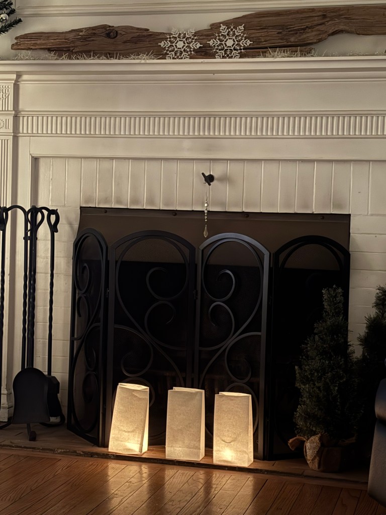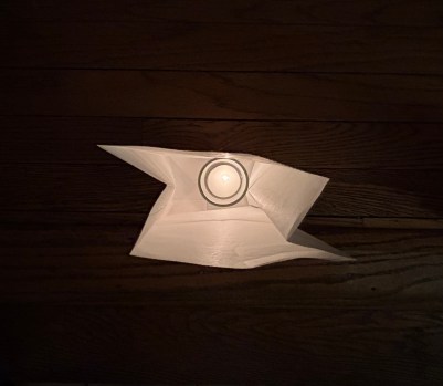 the three luminaria in front of our fireplace stayed lit for a couple hours. without the challenge of the wind, they burned brightly. we turned off the room lights and sat in a living room illuminated only by happy lights and tiny tea light candles.