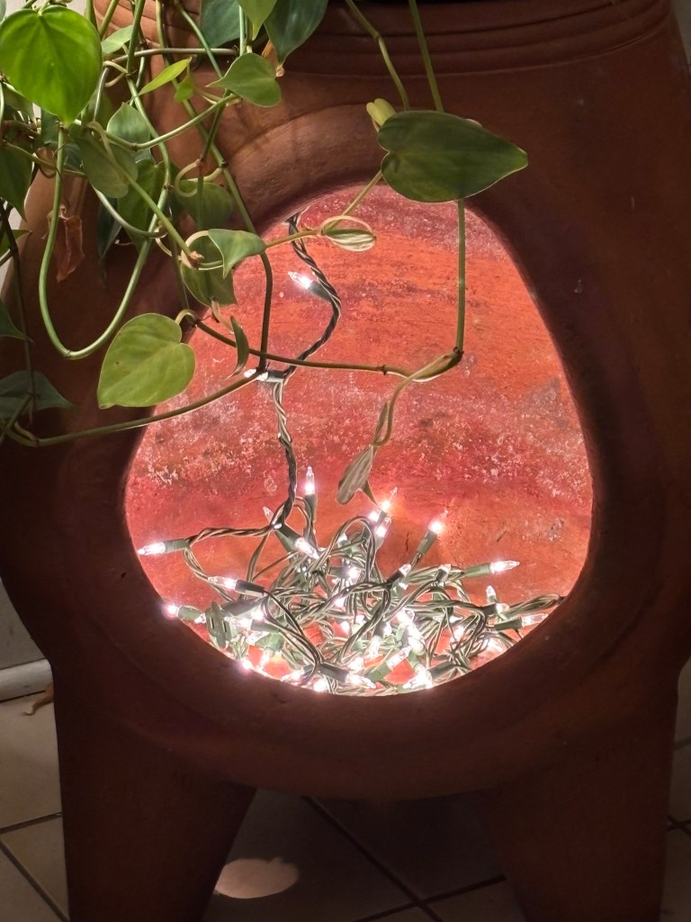 we tucked its gorgeously sculptural clay form into the corner of the sunroom, eliminating a high stool we tended to pile upon, simplifying the space. we added a strand of happy lights and a timer and we placed a heart-leafed philodendron on top of the chiminea’s cap.
