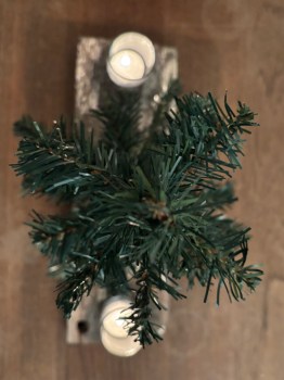 and what does the ceiling fan see, looking down at the centerpiece on the dining room table? what is the bird’s-eye view of this bit of old peeling-paint chairwood, this tiny dollar store tree, these glass votives, the glittery ornament tucked in? acknowledging that everything is clearly a bit easier if you are a ceiling fan, i wonder – is it thinking, “now, THIS is the stuff of christmas!”?