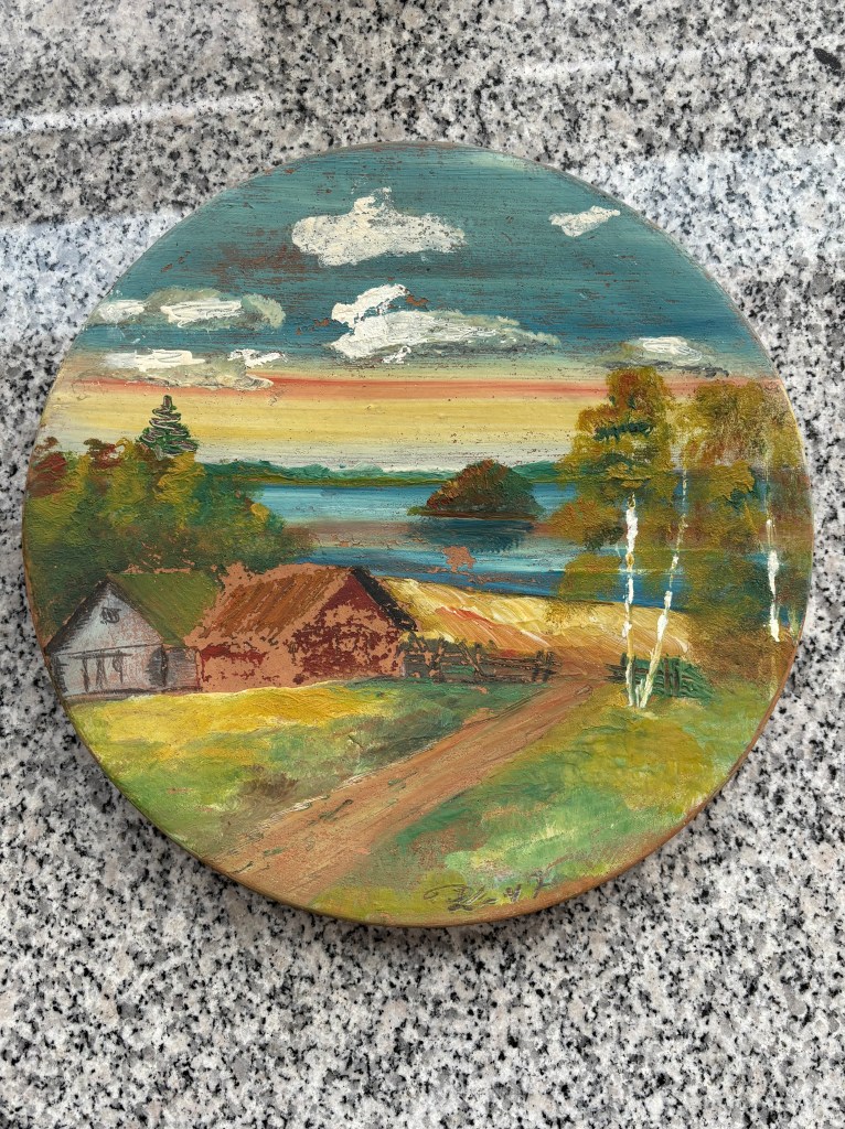 it is a raw clay plate dating back to the 1940s. signed by the artist in 1947, four years after my parents married, two years after world war II ended. the painting depicts a scene that i would guess most of us might yearn for: idyllic, quiet, a dirt driveway to land next to a lake, a house, a barn, aspen trees. really simple. really beautiful.