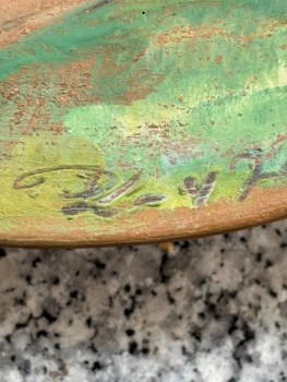 along the bottom edge of this plate – its paint peeling from lack of firing finish – is what appears the artist’s monogram logo and the number 47, clearly the year this decorative plate was completed.