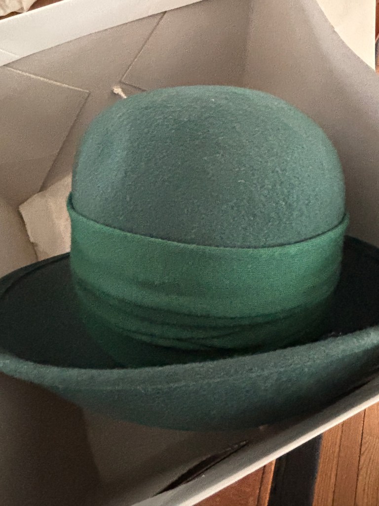 i used to wear hats. not baseball caps – i don’t have the right face shape for those. millinery hats. it was the 90s and i had straight-across bangs, which works best for hats – particularly when you have a high forehead – which i do as i inherited this from somewhere deep into and repeated on related faces time and again in my ancestry. nevertheless, i didn’t have a lot of these fancy hats – actually, only two: this green wool felt bowler-type hat and a black flat rim wool felt hat. i had a suede cowboy hat, and a couple of straw cowboy hats, but i wore the felt hats pretty consistently. i don’t wear them anymore and have decided to move them on. but not before telling d some stories about them, not before modeling them, grimacing at how they now look on me. sigh.