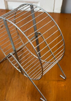 in the back corner of the storage room – up on the concrete ledge, behind the boiler and the hot water heater, in a bit of cobweb – sat this the metal wheel. next to it was a plastic exercise ball for small rodents and a water dispenser from a habitat used decades ago.