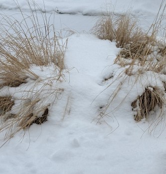 when spring comes – after the temperatures level out a little bit – we will cut these grasses down so that new growth will have room to burst through the soil. in the meanwhile the tracks around the grasses show that there are tiny creatures taking shelter in them, warmed by the fronds into which they are nestled. the snow is gorgeous – so bright out back i cannot comfortably look out the window.
