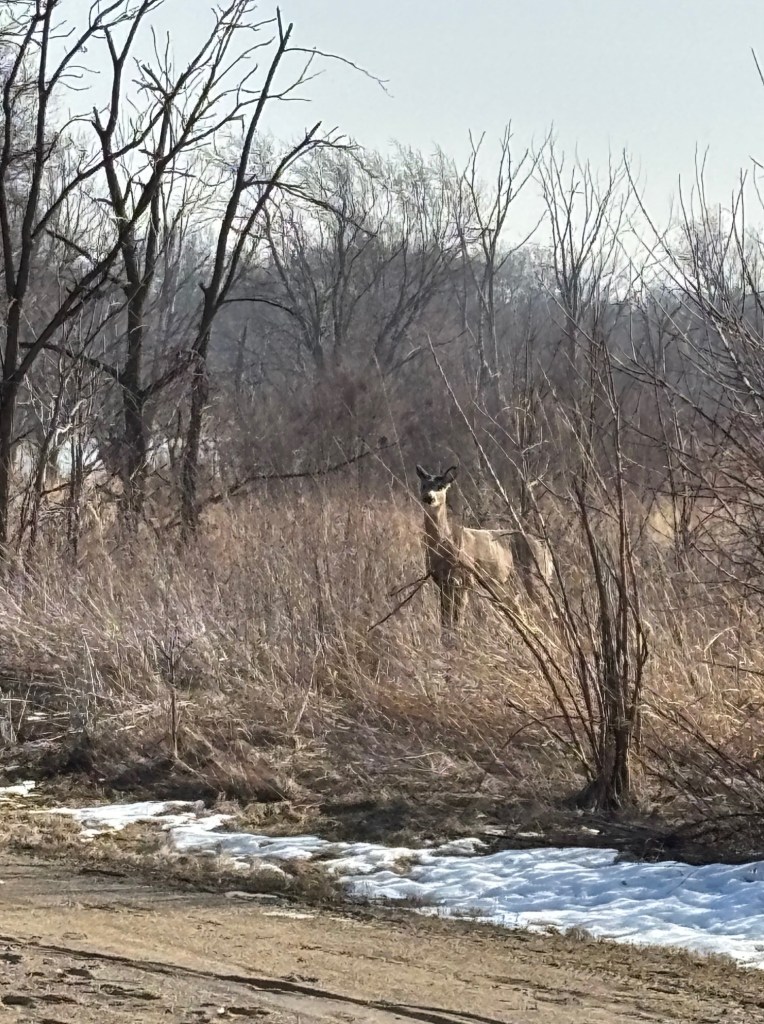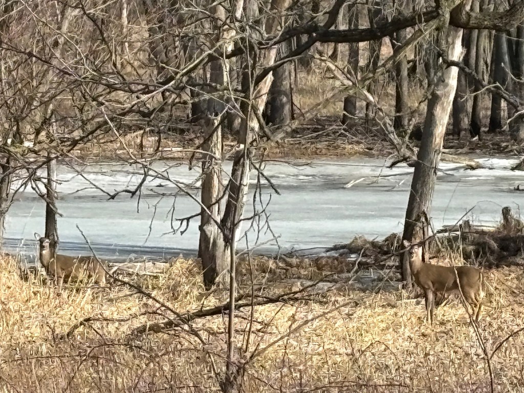 eventually i slowly moved forward a bit, to take a picture closer-up. eventually, both deer bounded down the rise and across the trail, heading for the river.