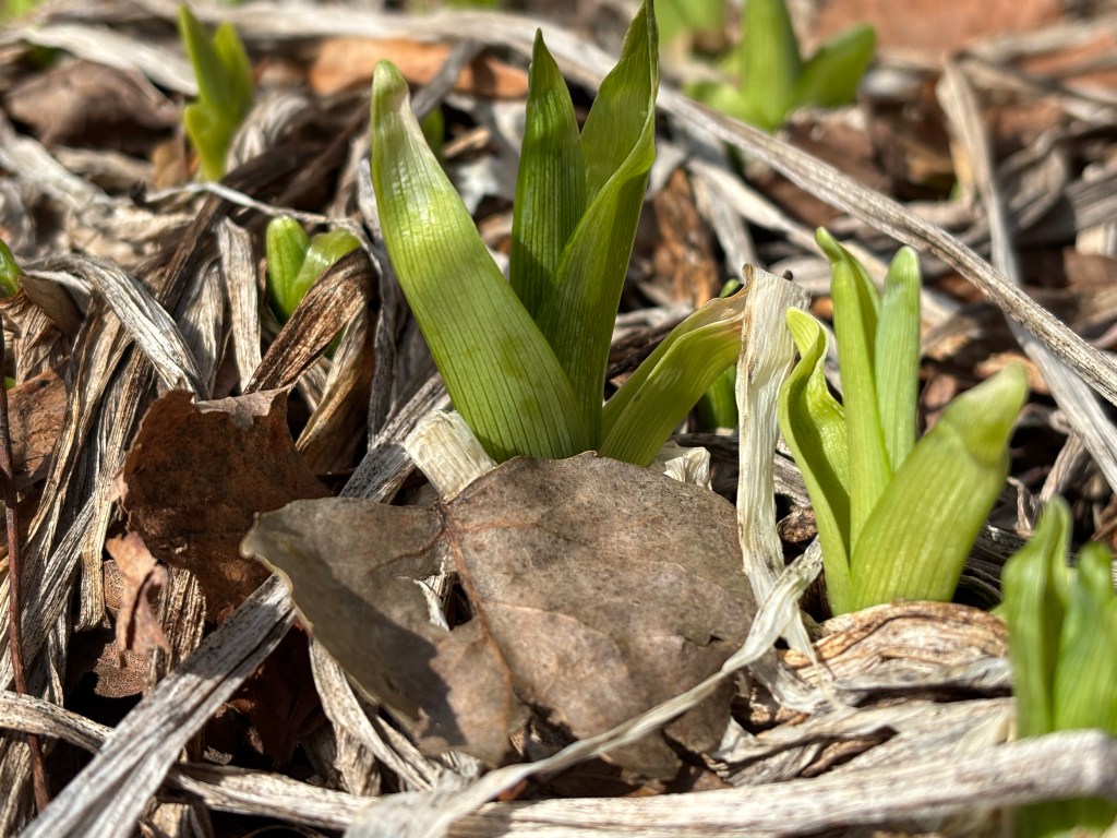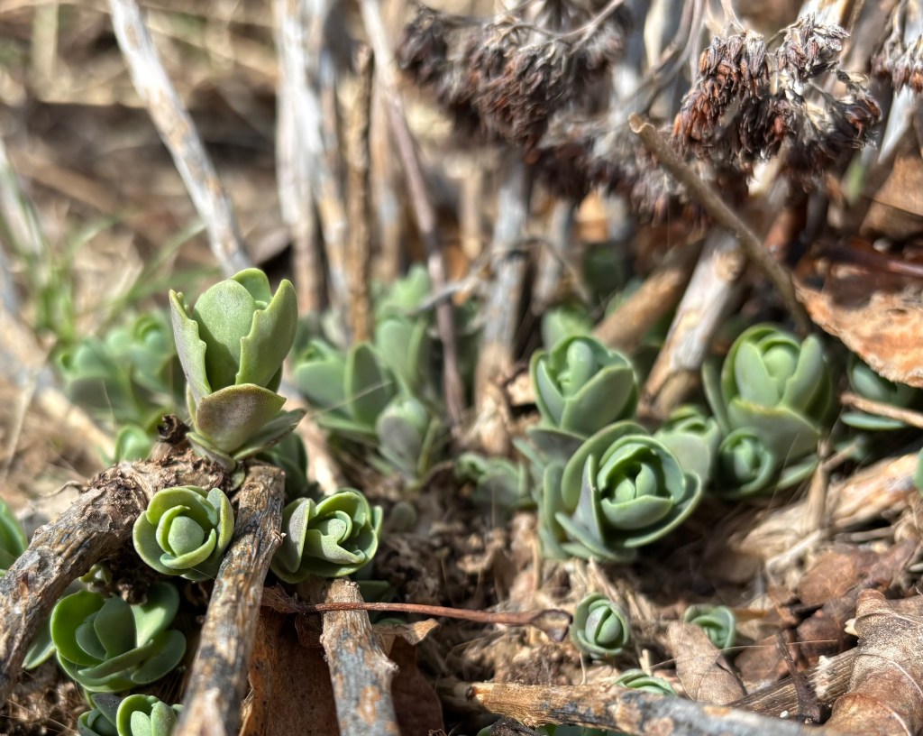 the old brick wall out front seems to hold the accumulating warmth of the afternoon sun. a couple days ago i went out there with my camera and was surprised to see tiny shoots of daylilies cozying up together in the leaves of fall we left there for insulation. even the little cabbages – sedum – in the front garden are appearing, tightly-wound and tucked into the dried stalks that remain. crazy.